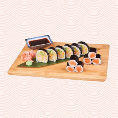 Futomaki z krewetką w tempurze, ogórkiem i szczypiorem (6 szt.) • hosomaki z łososiem (6 szt.).