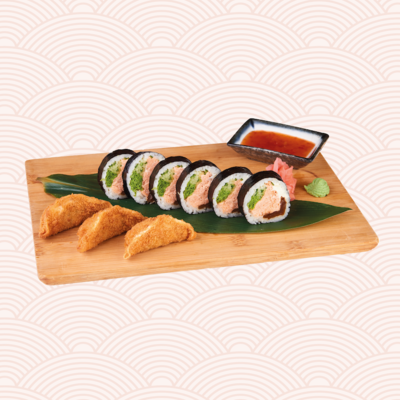 Futomaki z grillowanym łososiem, ogórkiem i marynowaną tykwą (6 szt.) • pierogi gyoza w panko, z kurczakiem i warzywami (3 szt.).