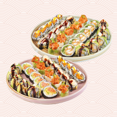 caterpillar roll z krewetką w tempurze (10 szt.) • futomaki z łososiem tataki (6 szt.) • summer roll z krewetką w tempurze i kimchi (10 szt.) • tempura roll z sumem kabayaki (12 szt.) • uramaki z warzywami w tempurze (10 szt.) • futomaki z ośmiornicą w tempurze (6 szt.). Porcja dla 4-5 osób.