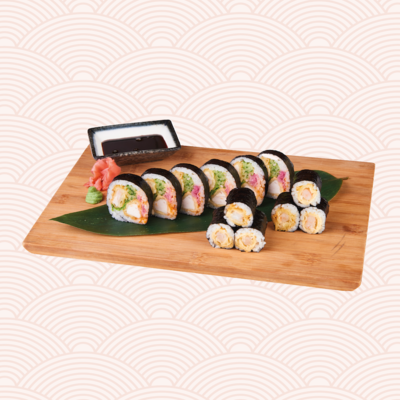 Futomaki z kurczakiem w tempurze, marynowaną cebulką i sosem spicy mayo (6 szt.) • hosomaki z krewetką w tempurze (6 szt.).